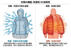 冬のアウターには「寒くない(寒さを通さない)」機能と「暖かい(熱を保つ)」機能という、全く異なる2つの役割があるのです。この違いを理解するだけで、冬の快適さが劇的に変わります。